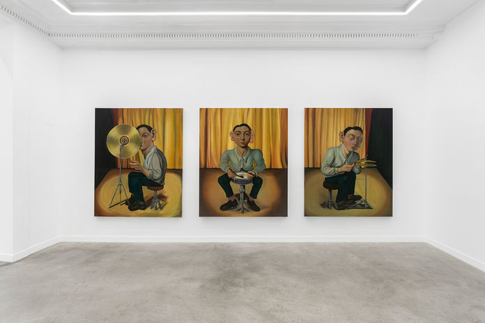 In a year spent frightened and fascinated by her own arrhythmia, Jess(ica) Valice began the first of the nine works that comprise this exhibition with the triptych. A man, inspired by her late father, dissembles a drum kit, and engages in a bizarre performance. Instead of in-sync, he plays each piece of the set, it appears, one beat at a time. This is a sonic portrayal of the break-up of a one-man band. It is happening at lightspeed and slow motion. His talent is both frayed and exacting, lazy and ingenious. Behold a musician framed at his agonizing peak and his soothing trough. Is this trio of glimpses, perhaps, a kind of musical ellipsis on the back of a funeral memento card? Or, instead, the first few delicate notes that became the heartbeat of the artist herself? Valice’s trademark faces—tight-lipped and unflinching—reveal nothing. This time, the oversized ears seem less a stylistic callback to past work, and more necessary as equipment. Not simply to bask in this limping instrumentation but to face the boos and applause and questions from the audience.